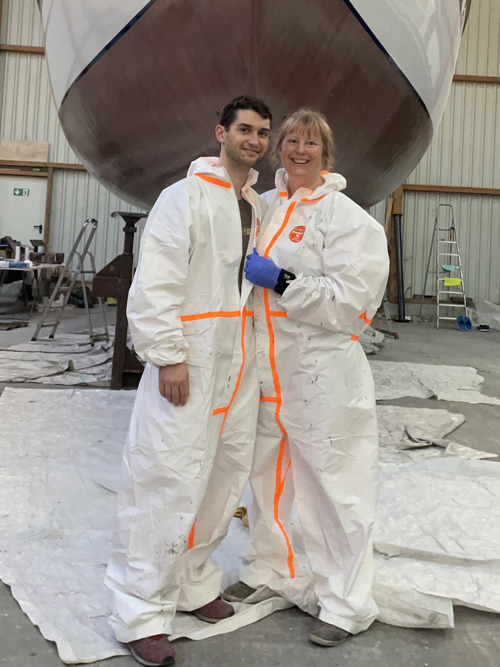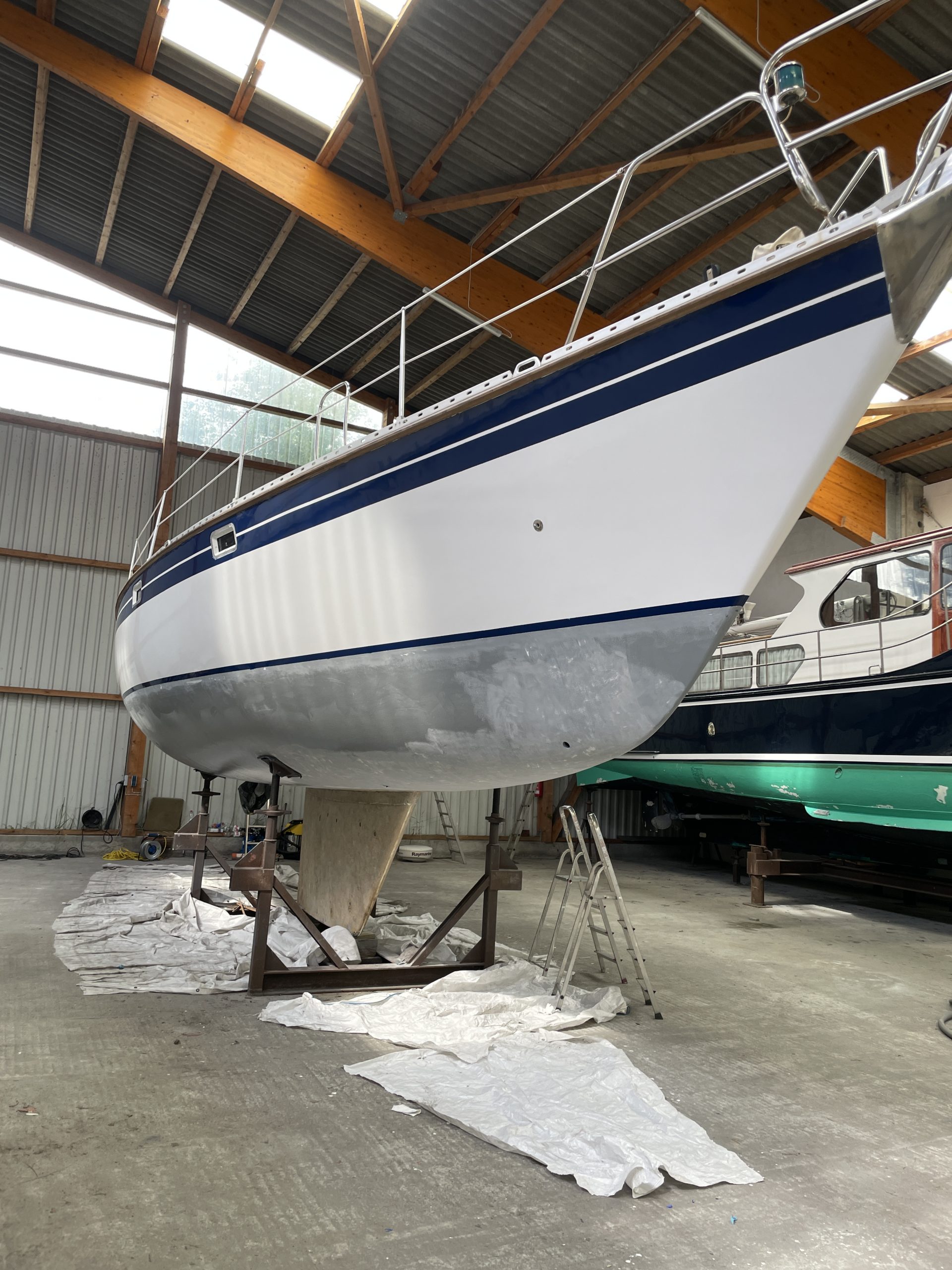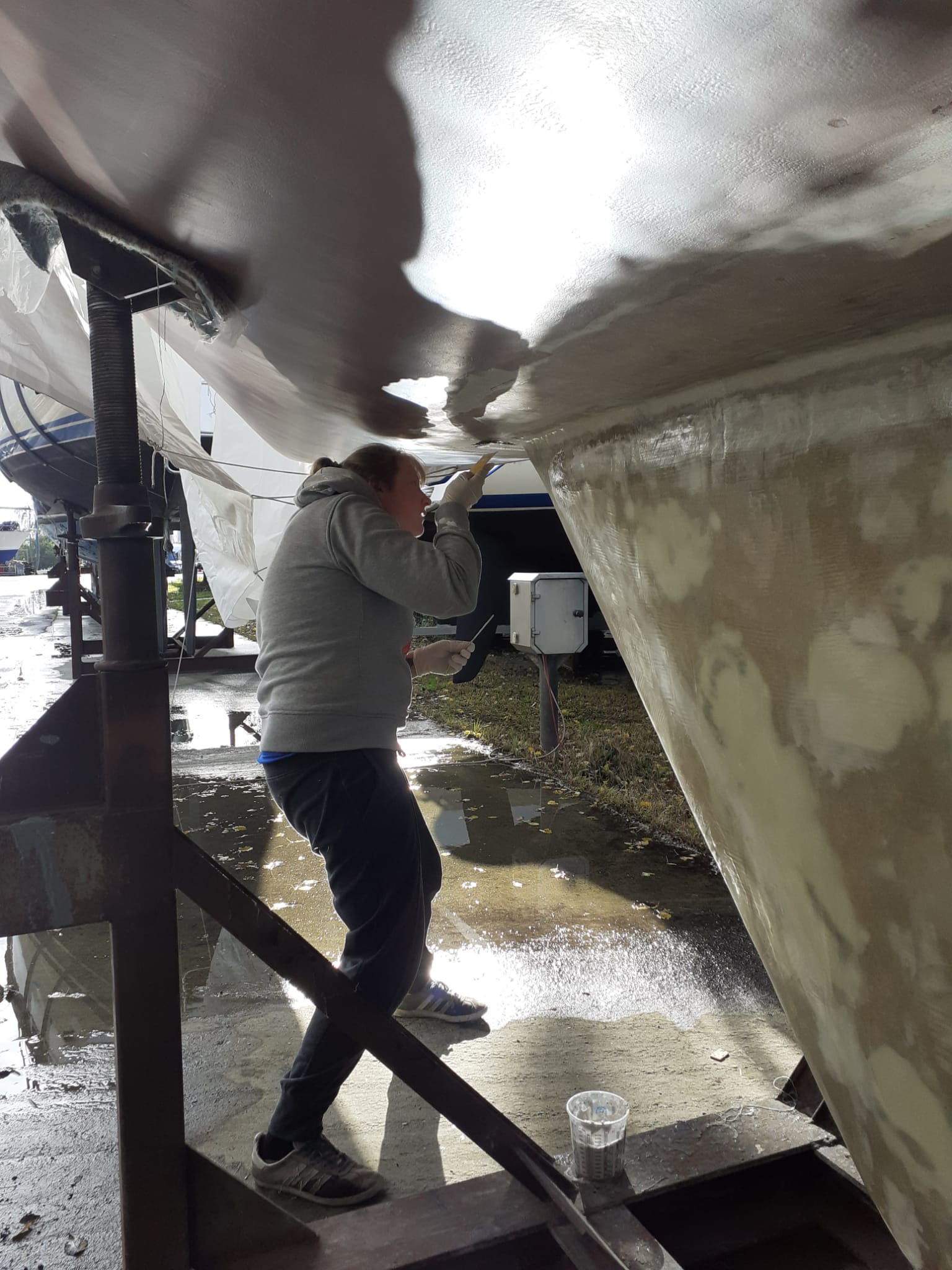 Über der Wasserlinie haben wir den alten Lack abgeschliffen und dann nach einer Grundierung den neuen Lack in mehreren Schichten aufgetragen.