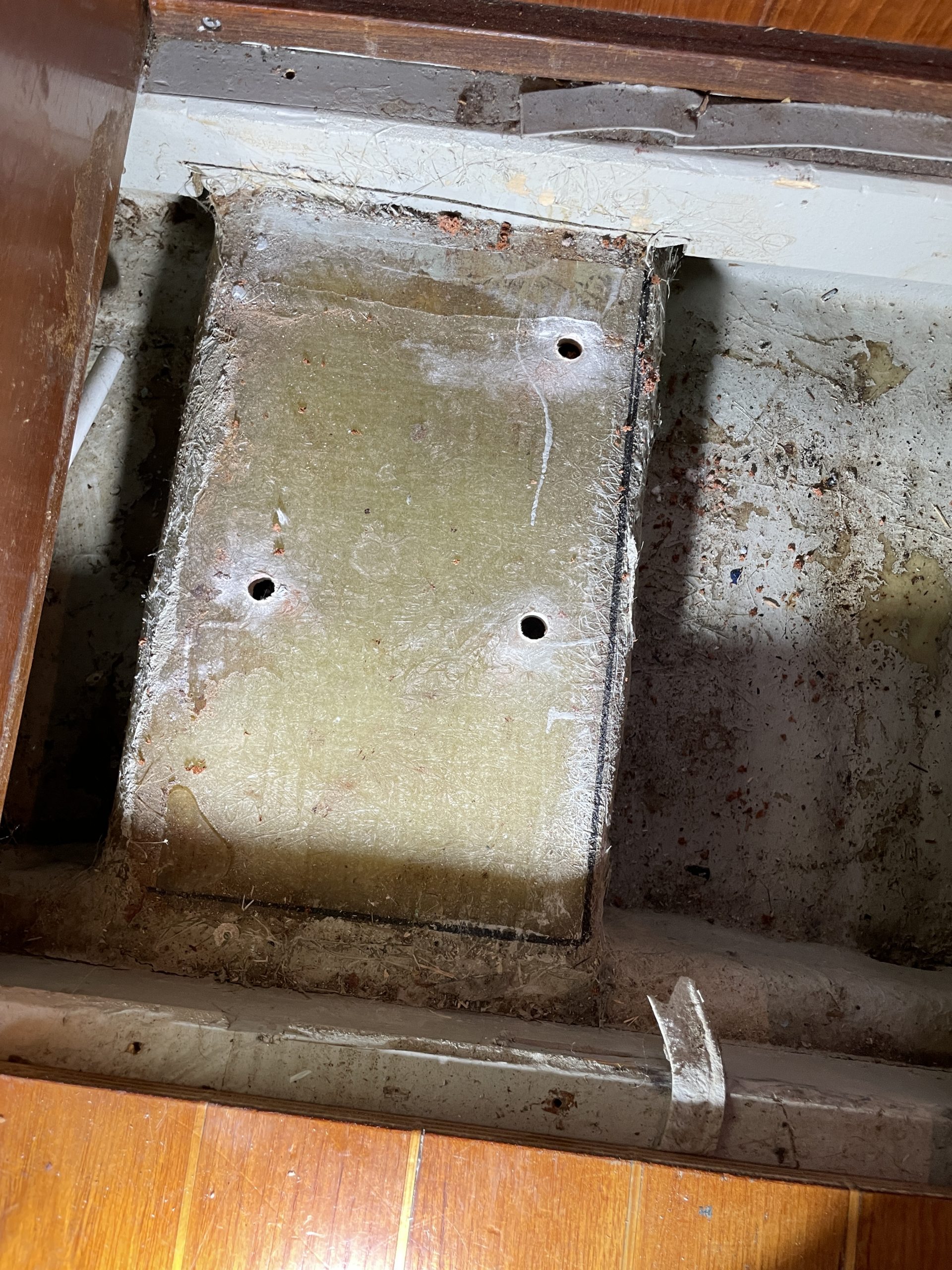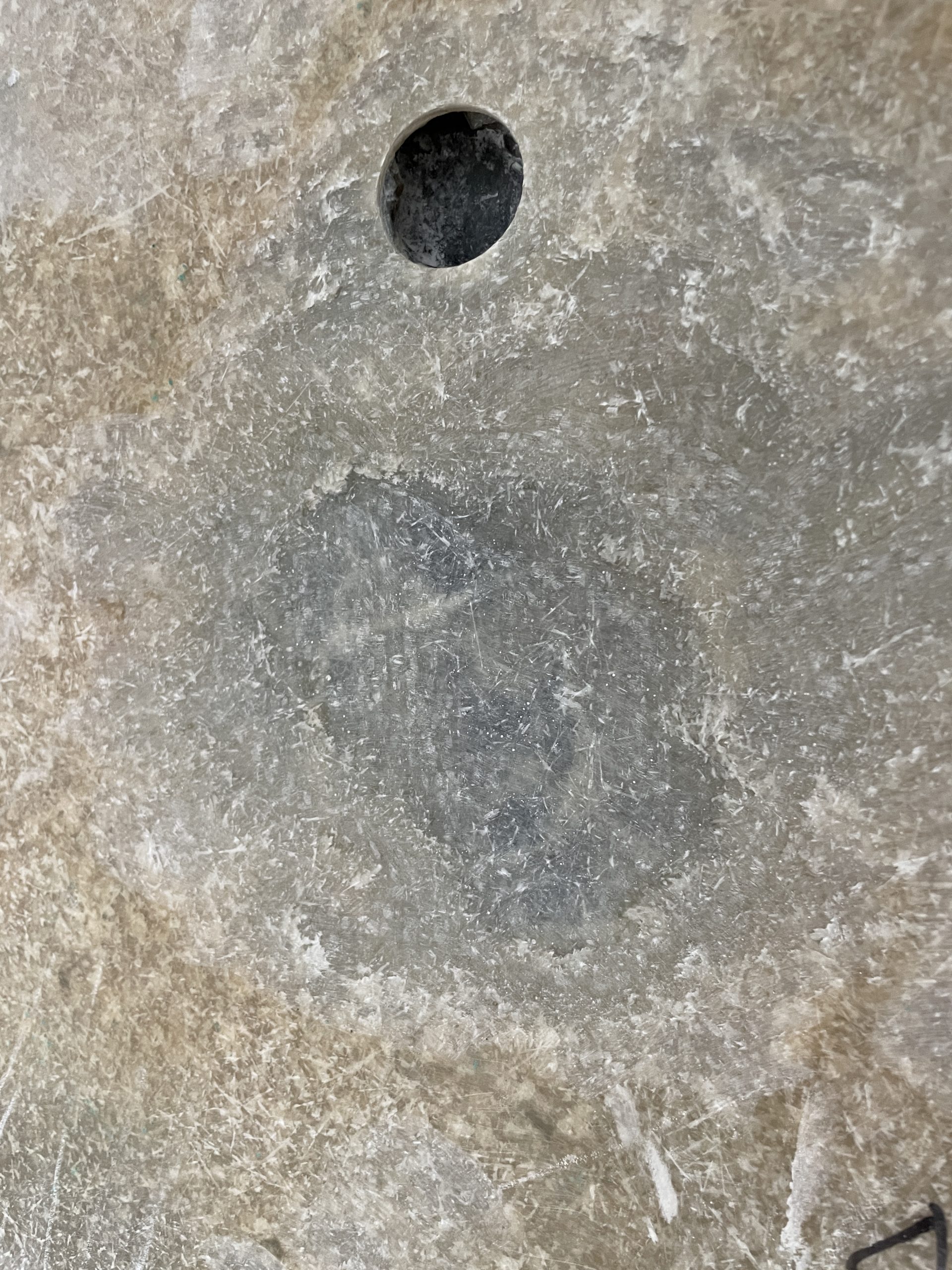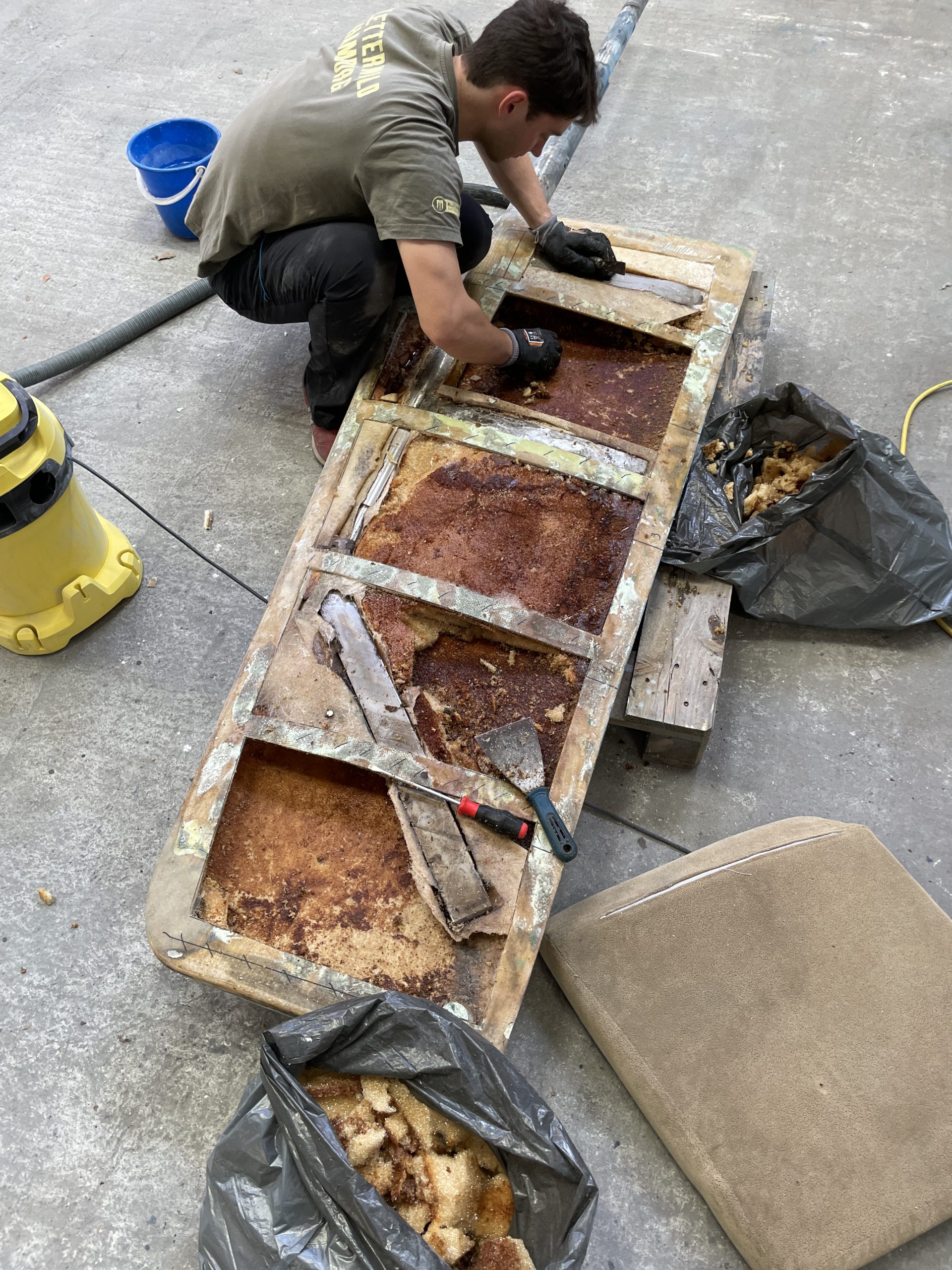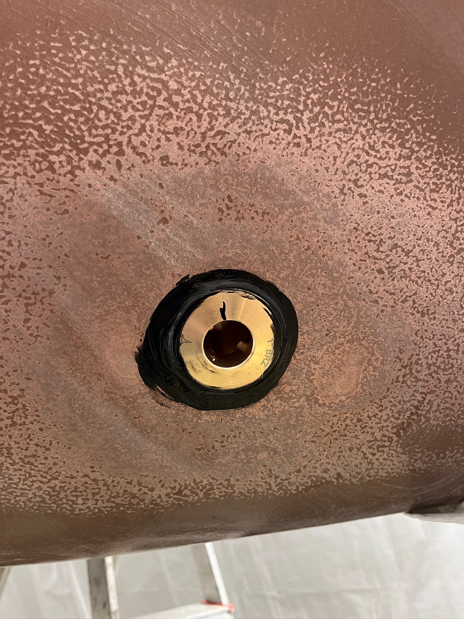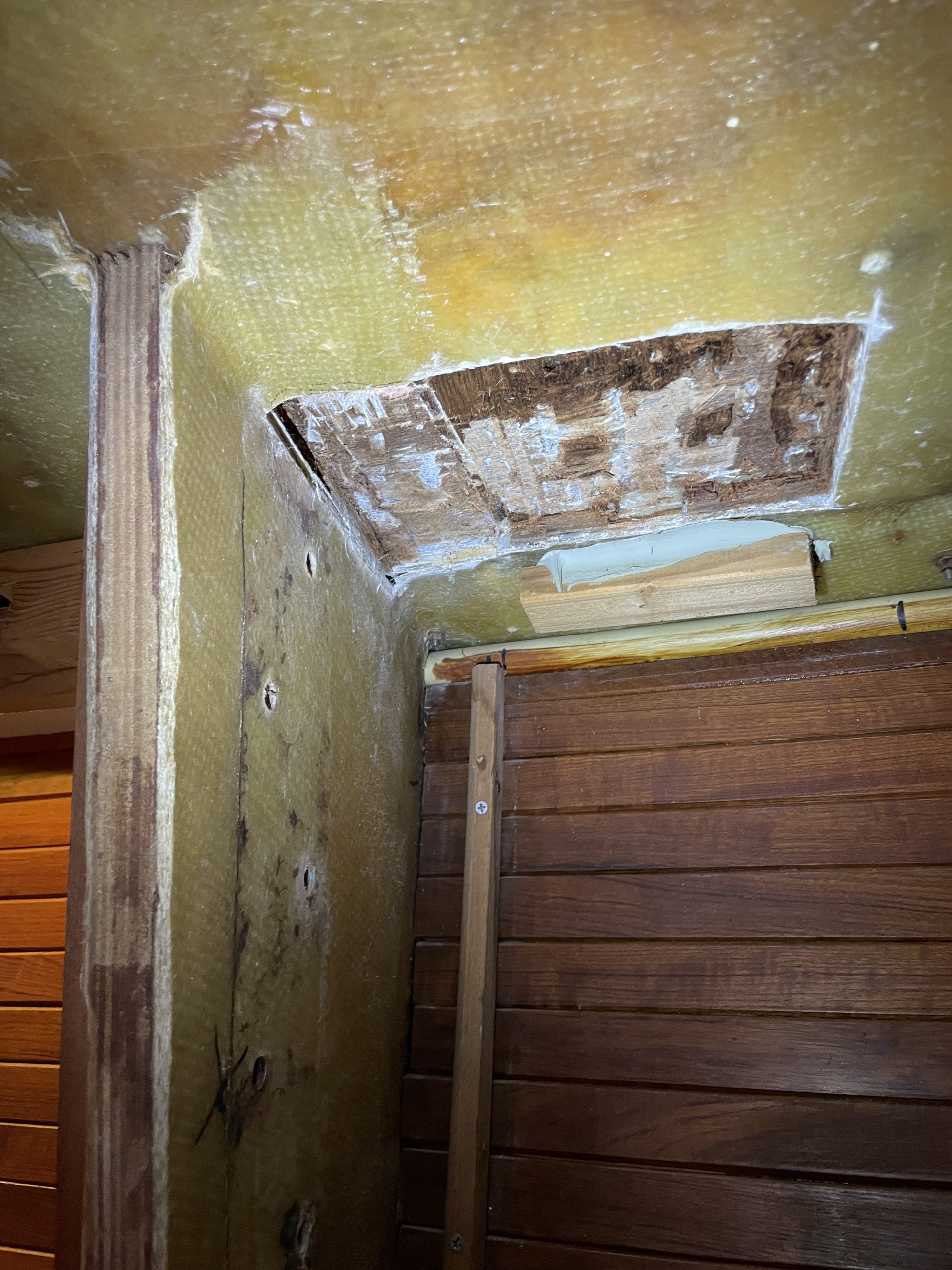Daher haben wir alles großflächig aufgebohrt, austrocknen lassen und danach mit vielen Schichten Laminat und Epoxy-Spachtel neu abgedichtet und versiegelt, damit nie wieder Wasser dort reinkommt. Den hohlen Bereich haben wir mit Gießharz aufgefüllt.