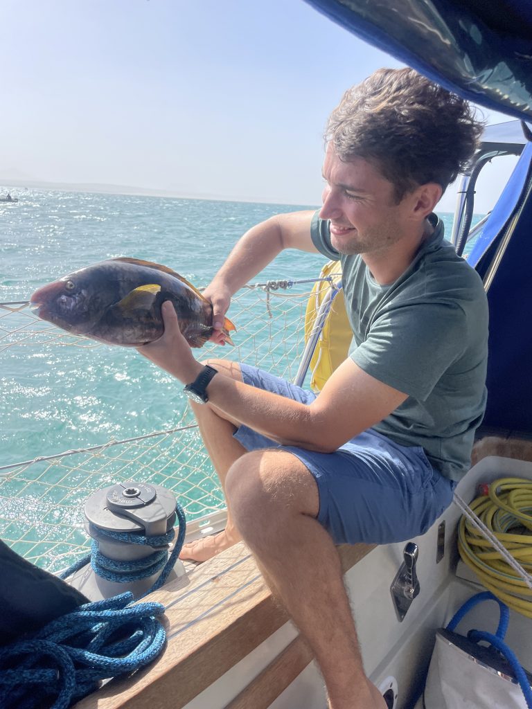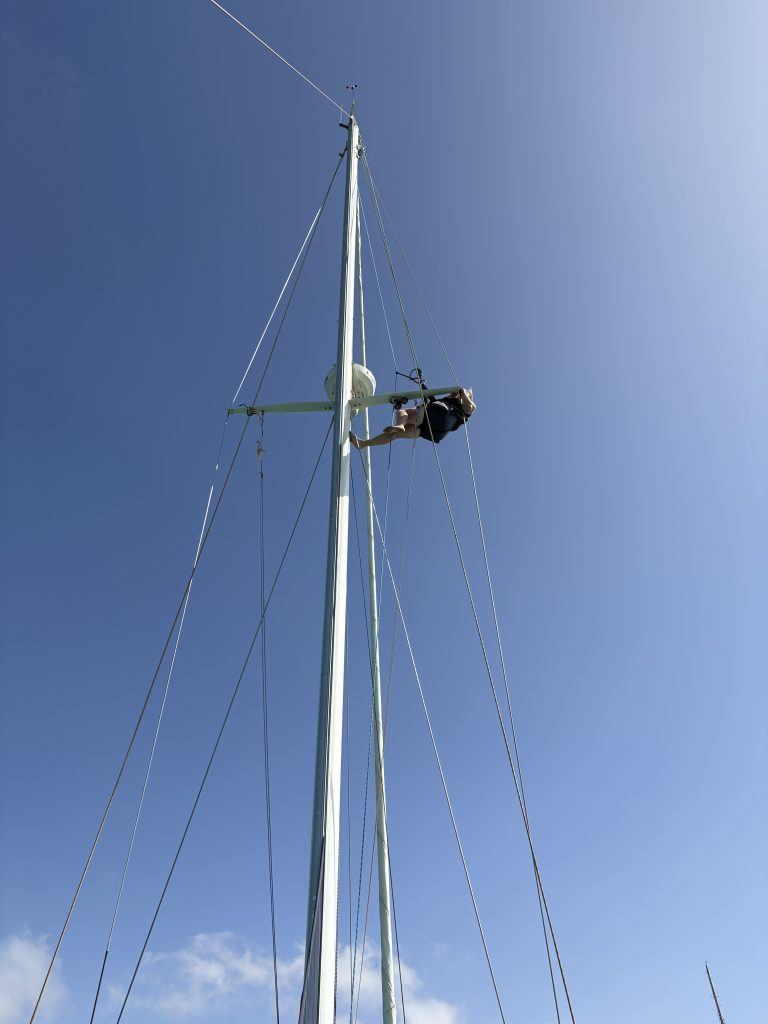 Als Laura ankam, machten wir uns gleich an das Anbringen der neuen Teile. Normalerweise würde man dafür in eine Marina mit einem Kran gehen, den Mast legen, die neuen Wanten etc anbringen und dann mit dem Kran den Mast wieder stellen. So was gab es aber nicht. Also mussten wir bei stehendem Mast Stück für Stück jedes Want einzeln tauschen – und das bei Wind und Welle an der Mooringboje. Das war schon recht aufregend für uns. Doch als wir fertig waren, kam endlich wieder ein positives Gefühl auf: Wir waren stolz auf diese Leistung.