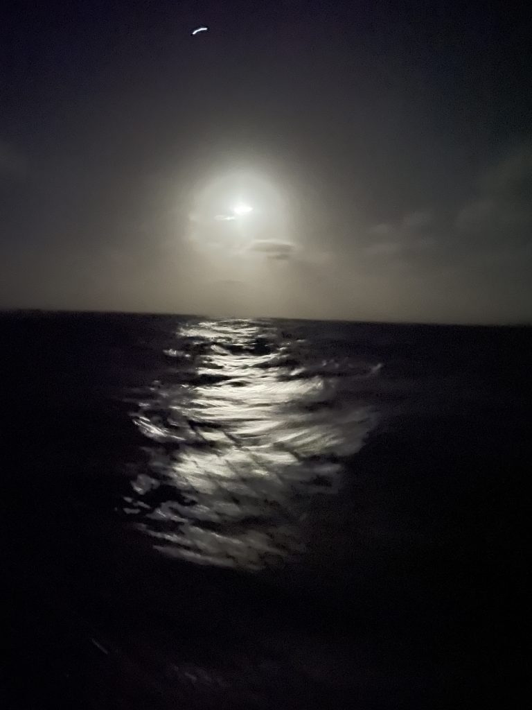 Und der Himmel war jeden Tag bzw Nacht wieder ein Spektakel. Es begann mit dem einem meist spektakulären Sonnenuntergang und ging weiter mit einem Nachthimmel, der sich mit Sternen so hell und viele wie man es aus Hamburg gar nicht kennt. Abgelöst irgendwann vom aufgehenden Mond, der (vor allem als er voller wurde) die Nacht komplett erhellt hat. Jede Wolke (davon gab es leider auch viele) konnten wir erkennen, jeden Squall nicht nur auf dem Radar sondern auch am Horizont sehen. Und fast immer endete die Nacht auch mit einem wunderschönen